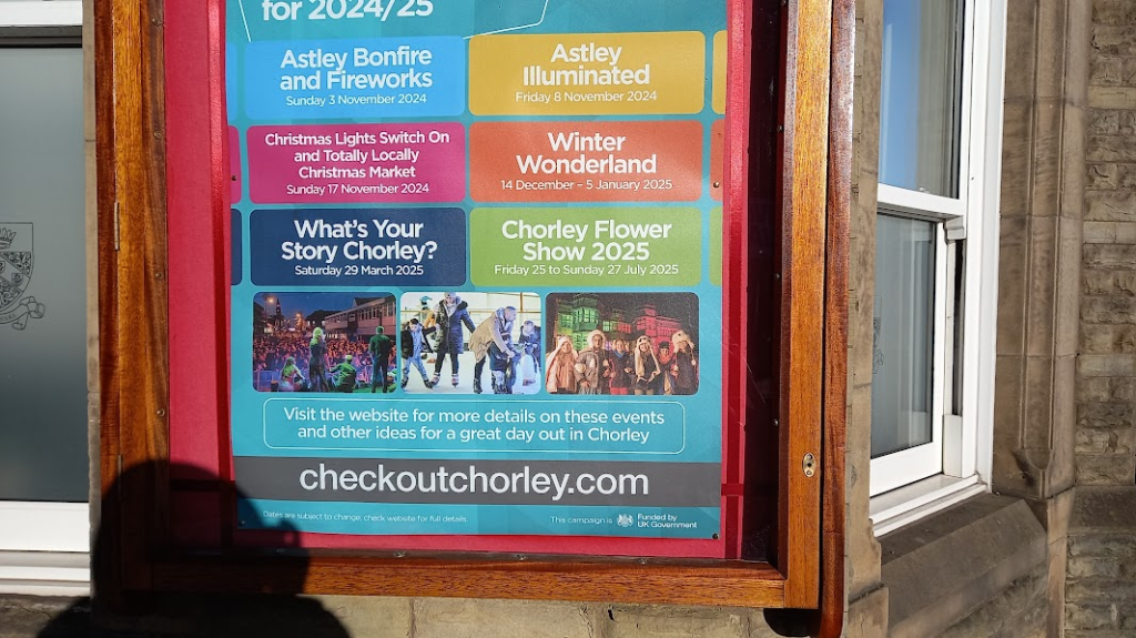 A leaflet notice board outside Chorley town hall.