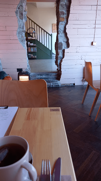 Do not fear nothing was broken it was such a lovely design, the door and display window where perfect, vintage darker green and matching darker orange ceiling, also wallpaper going up the stairs, i was downstairs i was about to sit on one of those high chairs near the main entrance but on staff saw i struggled and showed me the quite and lowe seats not sure how it looked like upstairs but more seats perhaps and maybe low seats. This cafe is where i will take my friends, family and even future children to.